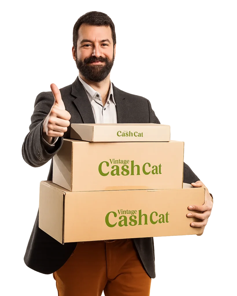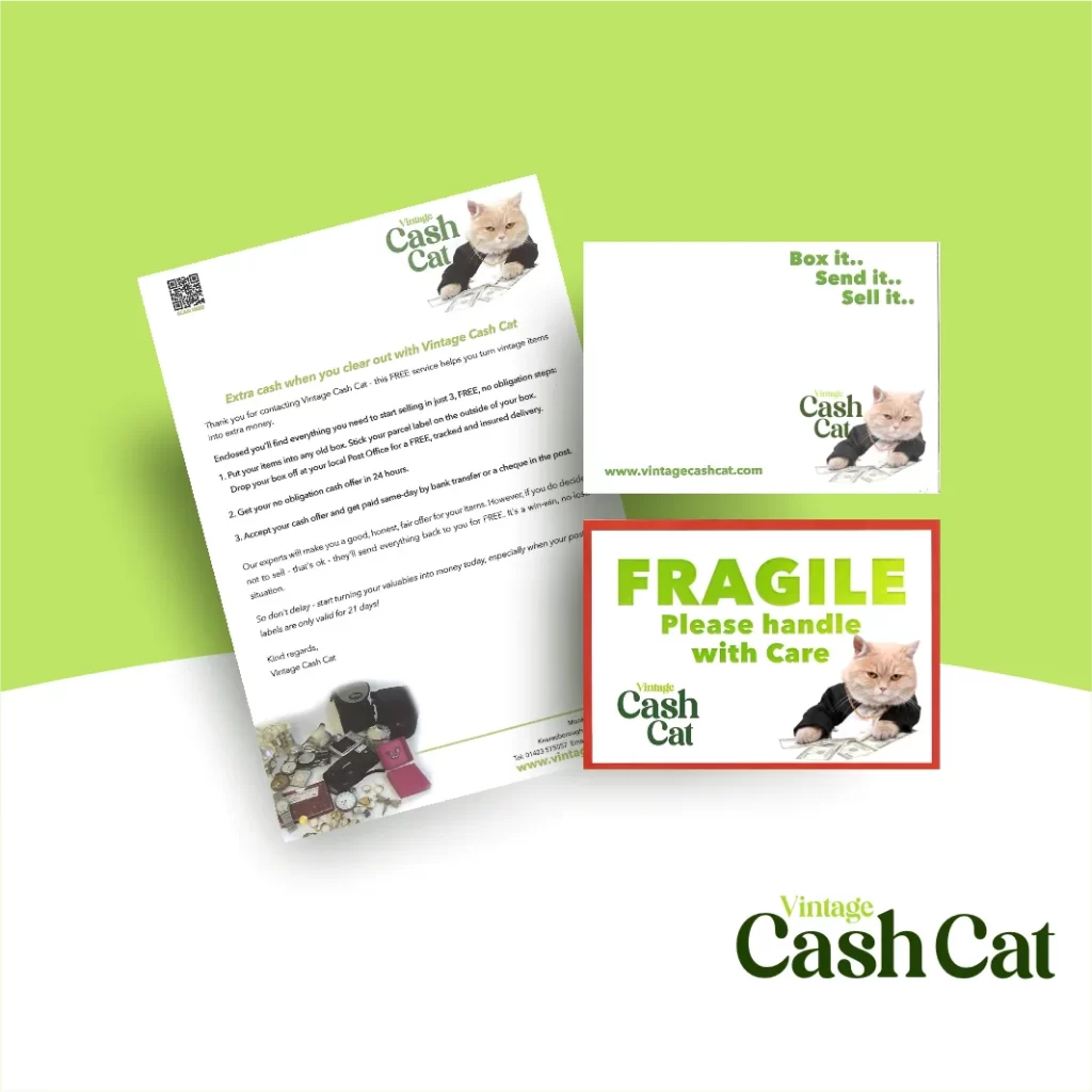 Experience a worry-free selling process with Vintage Cash Cat! Send your items confidently and fully insured to us and receive a no-obligation offer. Say hello to extra cash & get started today by requesting your free postage pack. Wait for your offer and enjoy our hassle-free service.